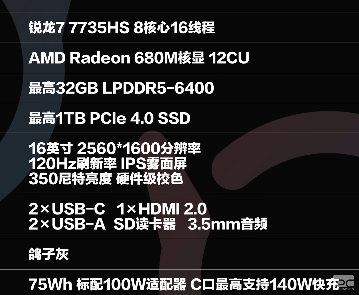 配置方面,联想小新 Pro 16 2023 锐龙版搭载的是 R7 7735HS,也就是 R7 6800HS 的 0.05GHz 提频版,核显配置,GPU 依旧是 Radeon 680M,最高配备 32GB 内存和 1TB SSD。屏幕为 16 英寸 2560*1600 分辨率,120Hz 刷新率。机身接口包括两个 USB-C、两个 USB-A、一个 HDMI 2.0 接口,一个 SD 读卡器和一个 3.5mm 音频接口。电池为 75Wh,标配 100W 适配器,USB-C 接口最高支持 140W 快充。